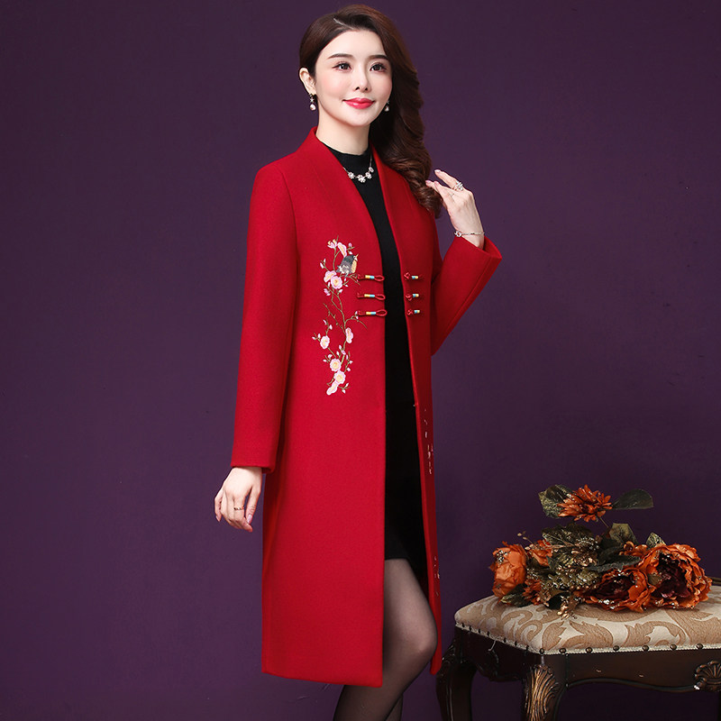 秋冬202新款妈妈现代时尚改良旗袍高端毛呢大衣中长款开衫外套女