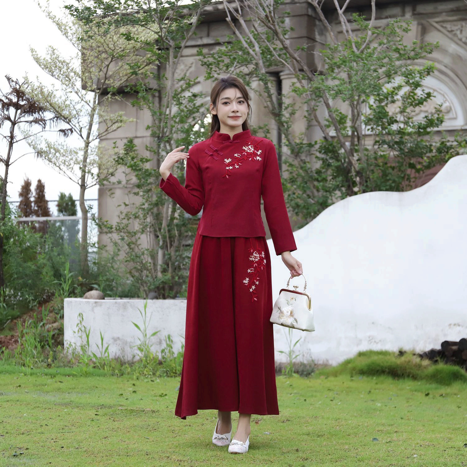 民族风复古两件套秋冬女装新款中式斜襟盘扣绣花长袖上衣刺绣裙子