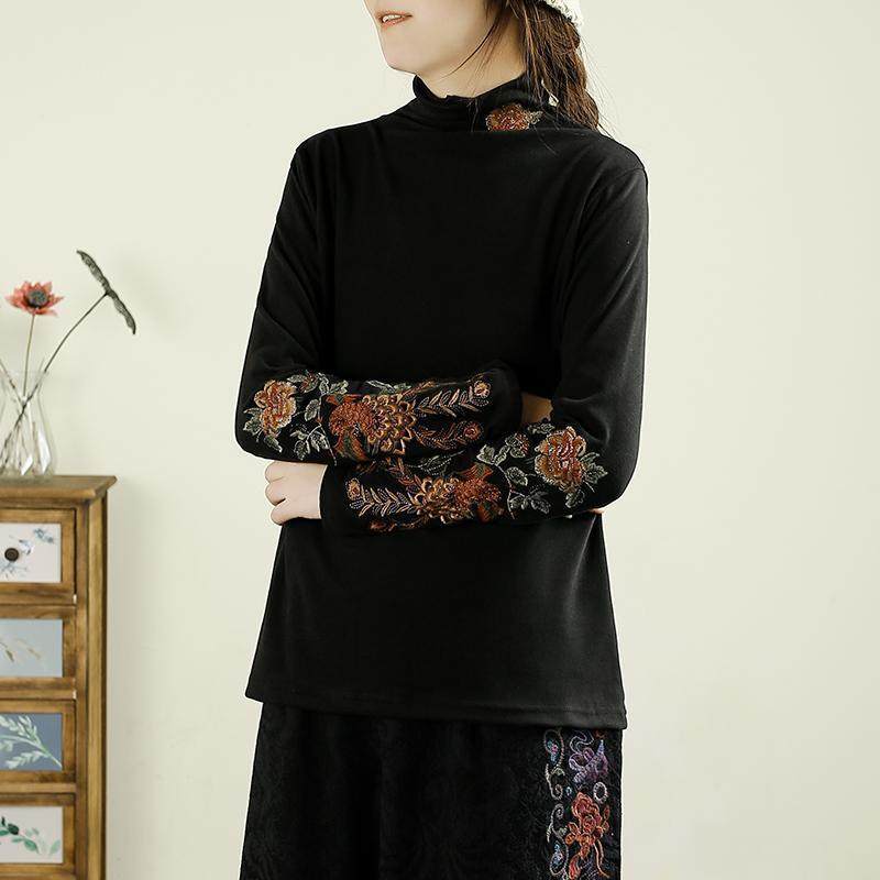 高领刺绣打底衫女民族风上衣复古风外穿百搭双面德绒长袖女士T恤