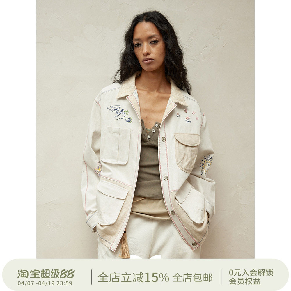 MOVEUP幻走2025秋季新款.FUN系列纯棉大方领贴袋绣花短款外套女