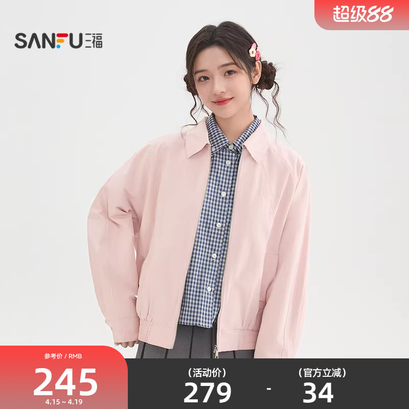 三福外套2026新款春季英文绣花格子宽松净色夹克女装517347