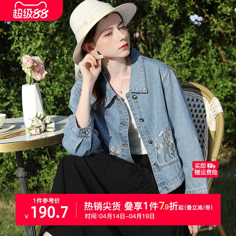 艾蓓怡蓝色钉珠绣花柔软短款牛仔外套女2026春季新款绝美巨好看