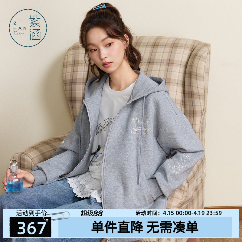 紫涵连帽灰色卫衣外套女士秋季新款户外休闲绣花宽松显瘦拉链开衫