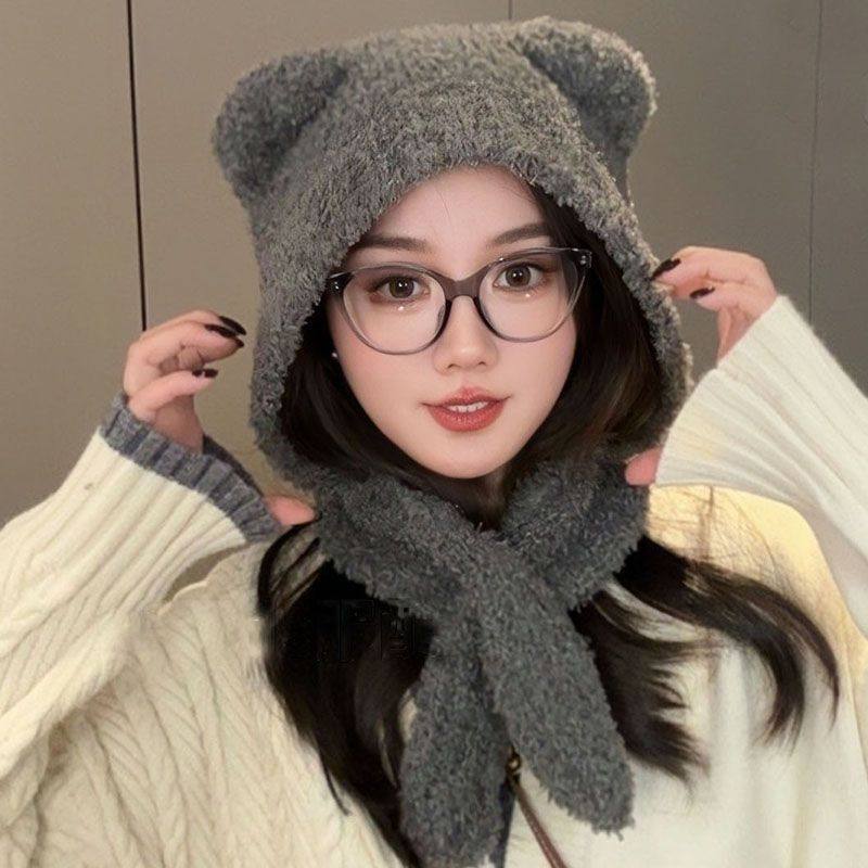 可爱小熊帽子围巾一体女新款秋冬季加绒围脖防寒保暖毛茸茸护耳帽