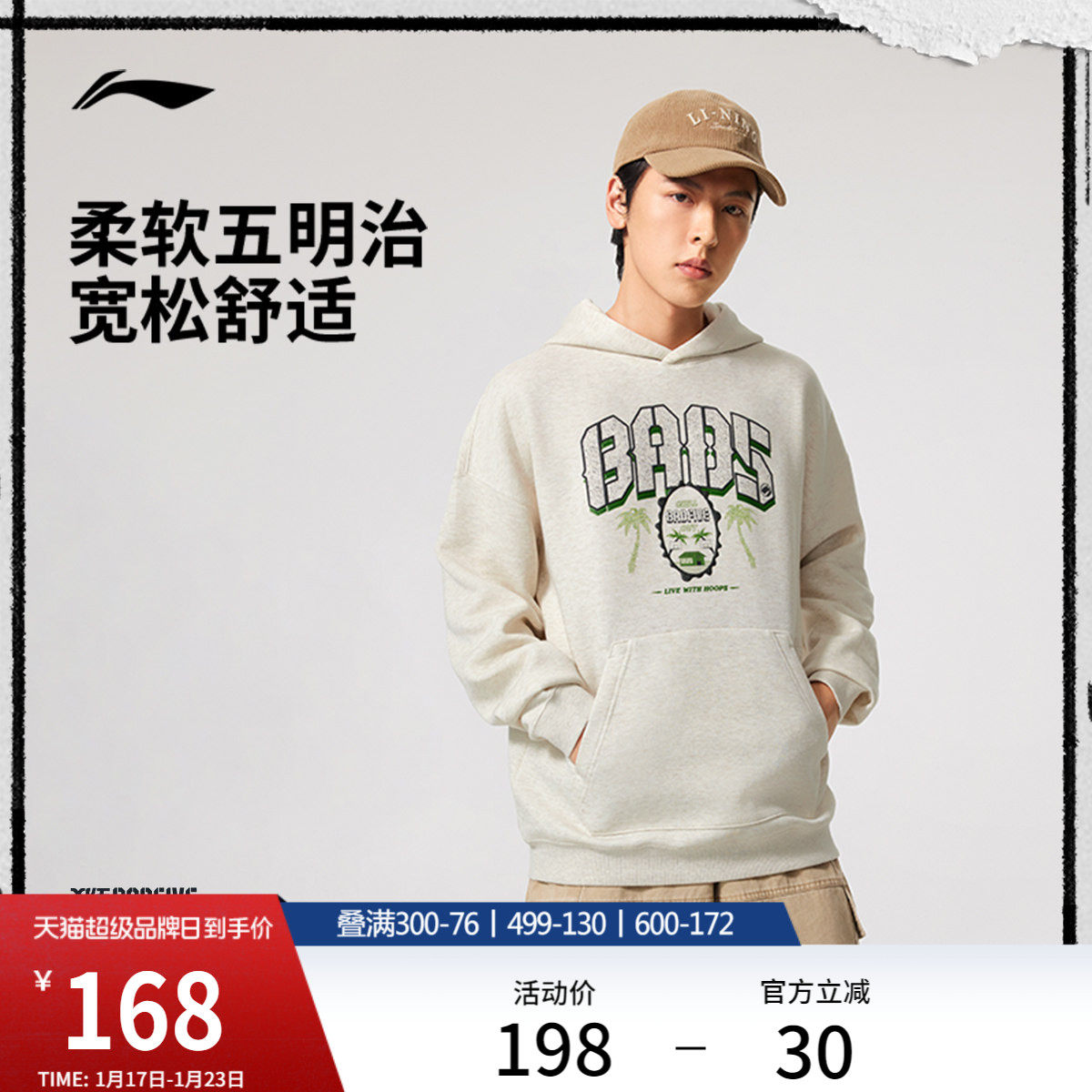 李宁反伍BADFIVE 卫衣男款官方冬季新款帽衫宽松连帽上衣运动服男