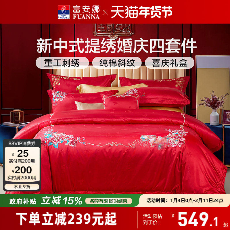 富安娜结婚四件套婚庆床上用品红色喜庆新婚婚嫁床单婚房床品被套