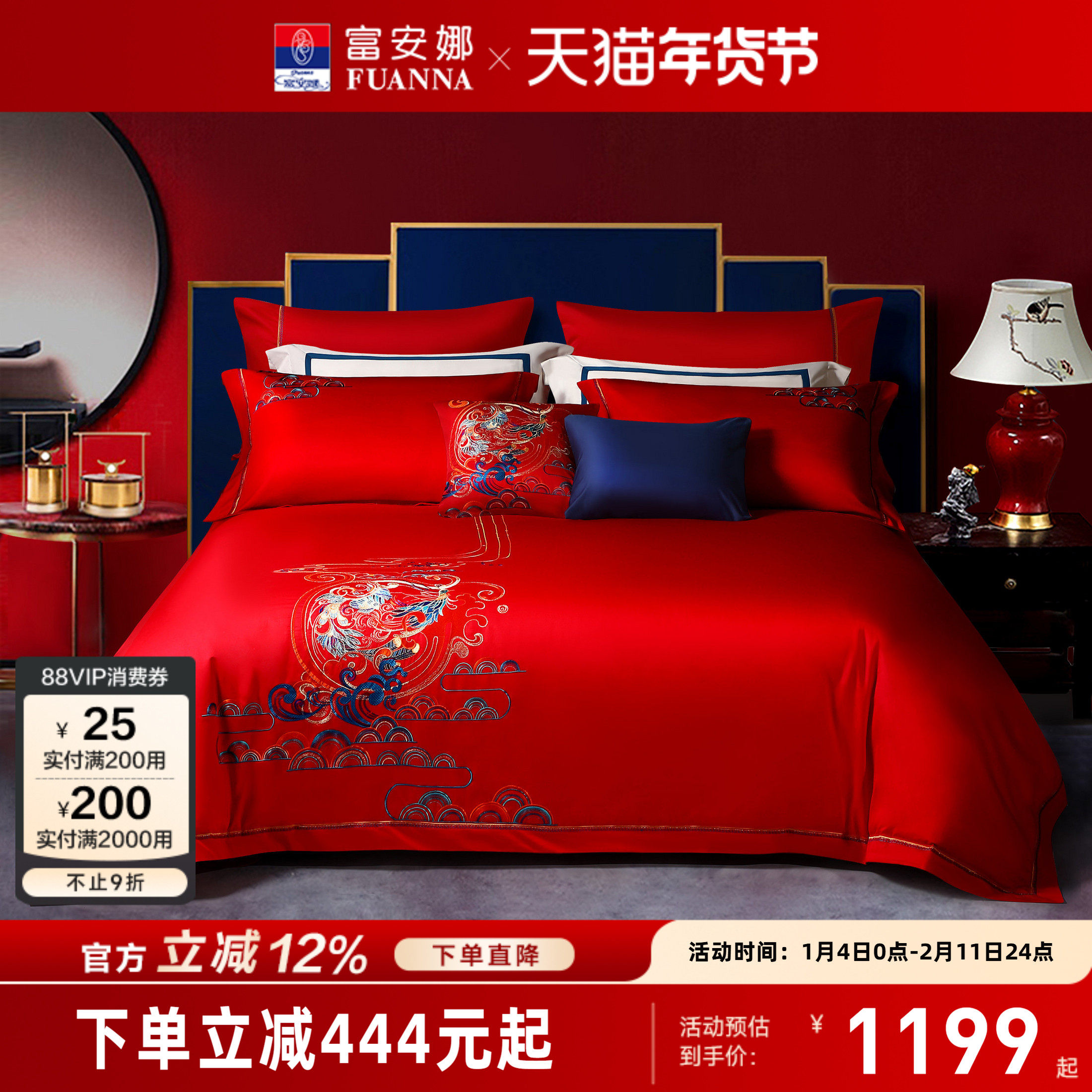 富安娜60支长绒棉婚庆四件套结婚床品婚嫁纯棉六件套床上用品新品
