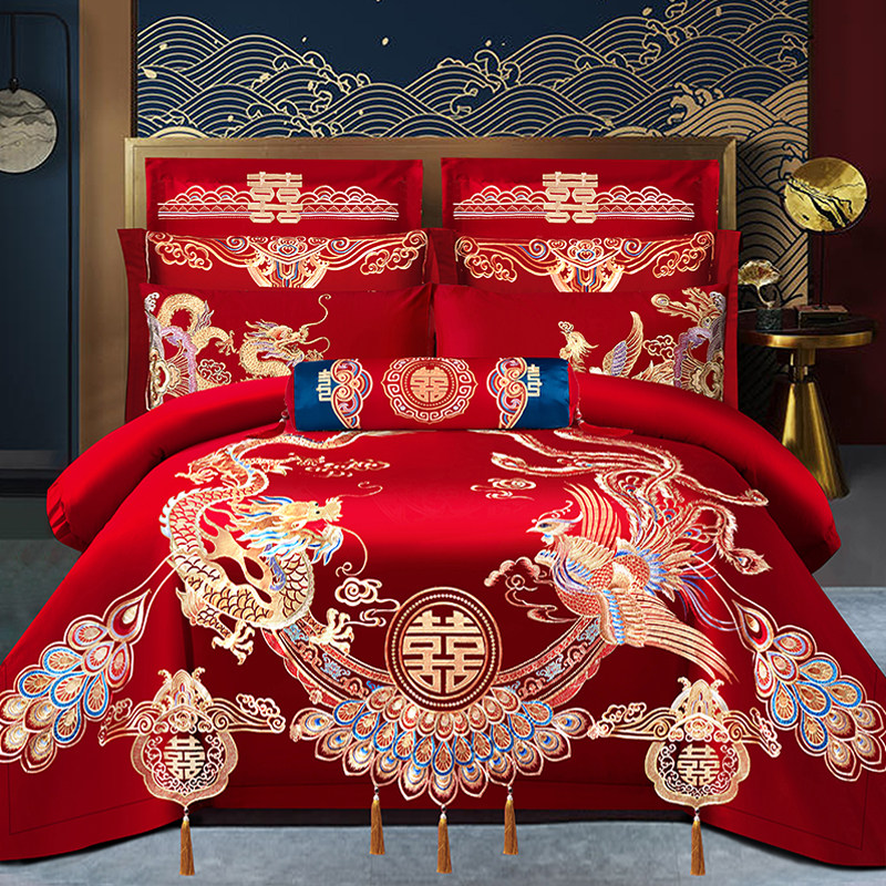 婚庆四件套大红结婚高端全棉刺绣120S长绒棉龙凤纯棉喜被床上用品