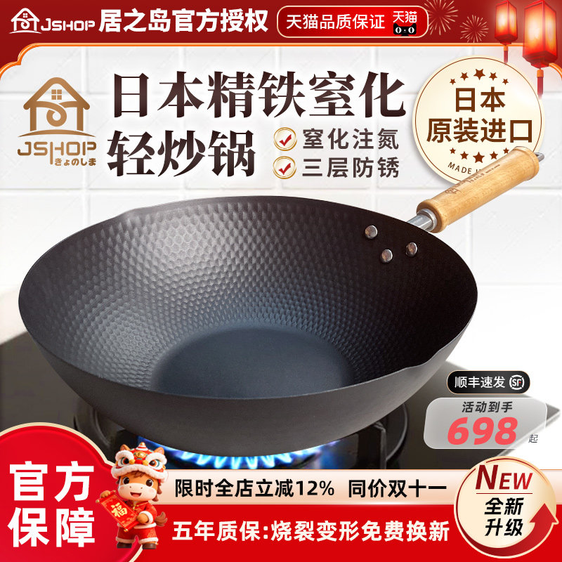 居之岛日本原装进口铁锅氮化锅极铁锅无涂层不易粘健康炒菜锅窒化