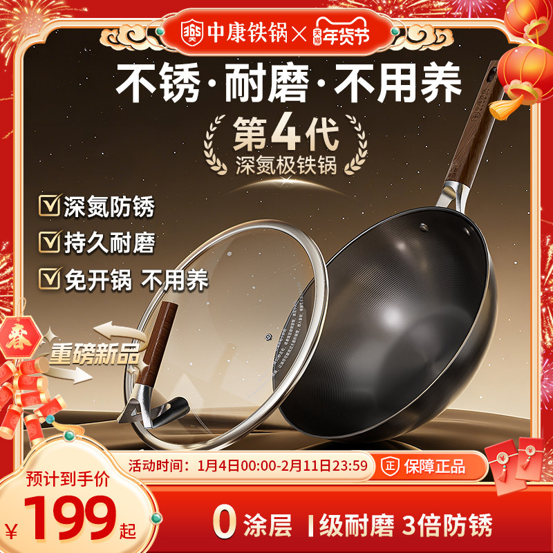 【第四代】中康铁锅精铁炒锅家用无涂层氮化不锈极铁锅老式炒菜锅