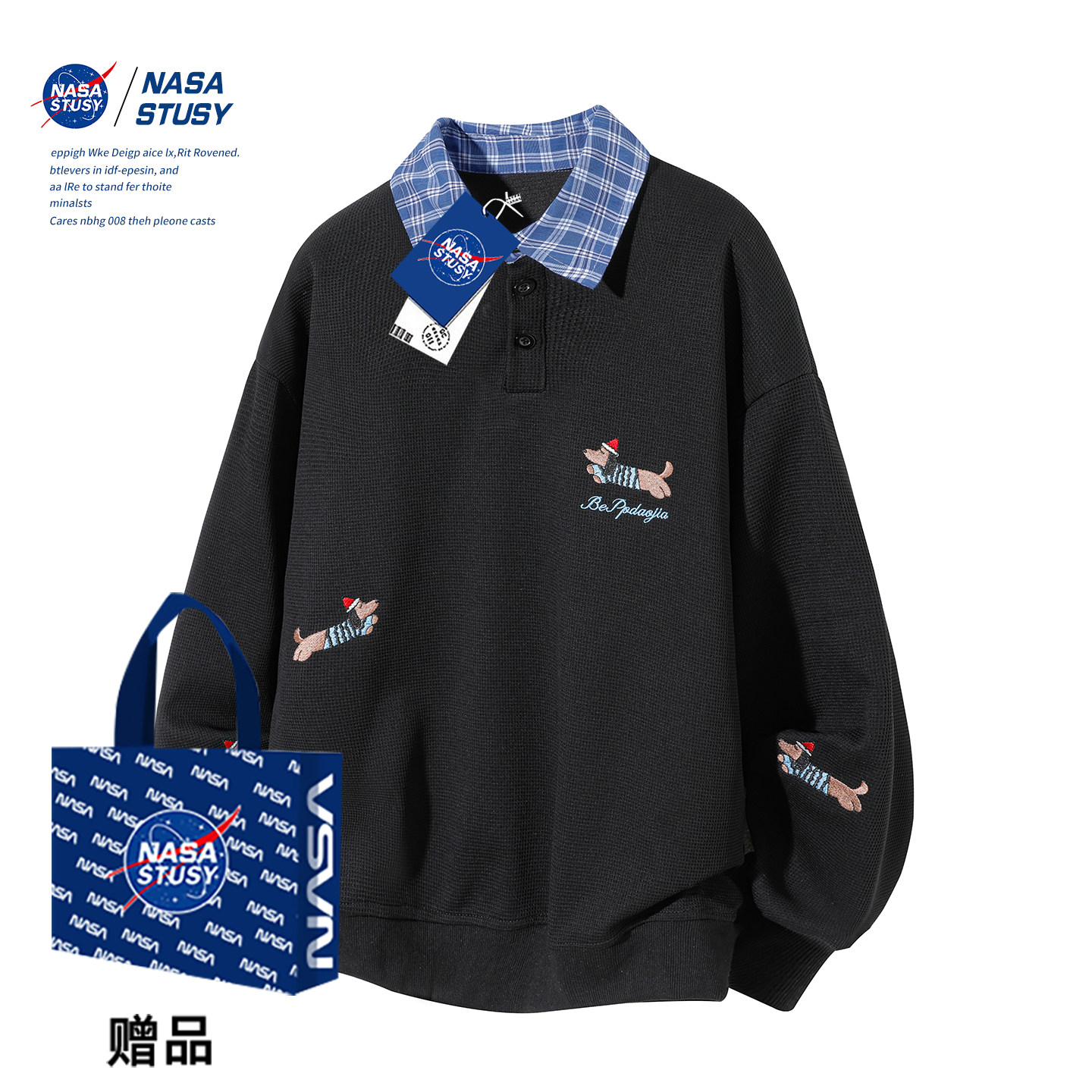 NASA STUSY美式高街2026新款春秋装男款情侣潮牌衬衫领假两件卫衣