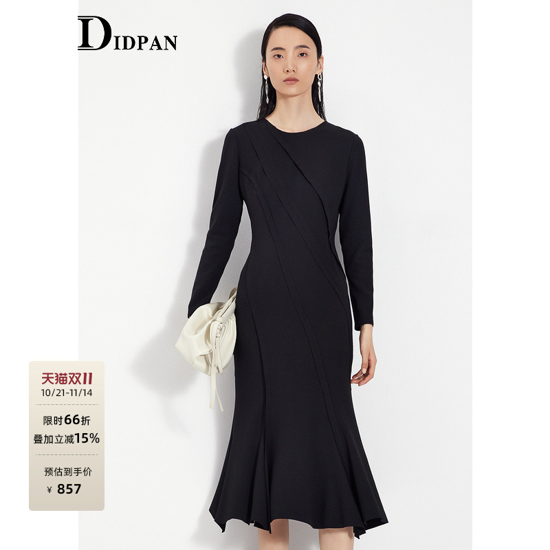 IDPAN黑色修身连衣裙通勤女装秋季新款设计感收腰显瘦包臀鱼尾裙