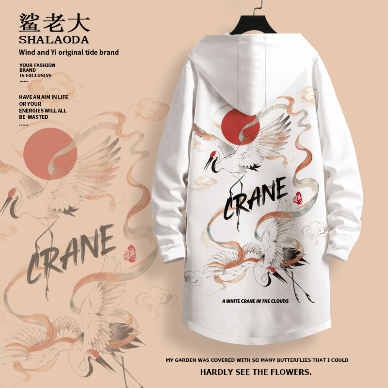 仙鹤印花风衣外套男冬季新款连帽大衣oversize中长款加厚休闲开衫