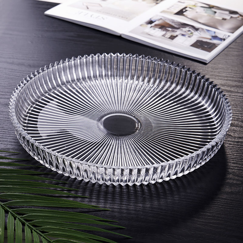 欧式简约条纹水晶玻璃水果盘轻奢家用收纳托盘圆形大号茶盘置物盘