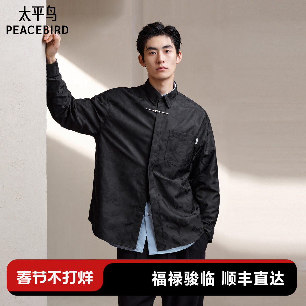 【新中式】太平鸟男装 休闲衬衫2025春新款暗纹提花衬衫男士衬衣