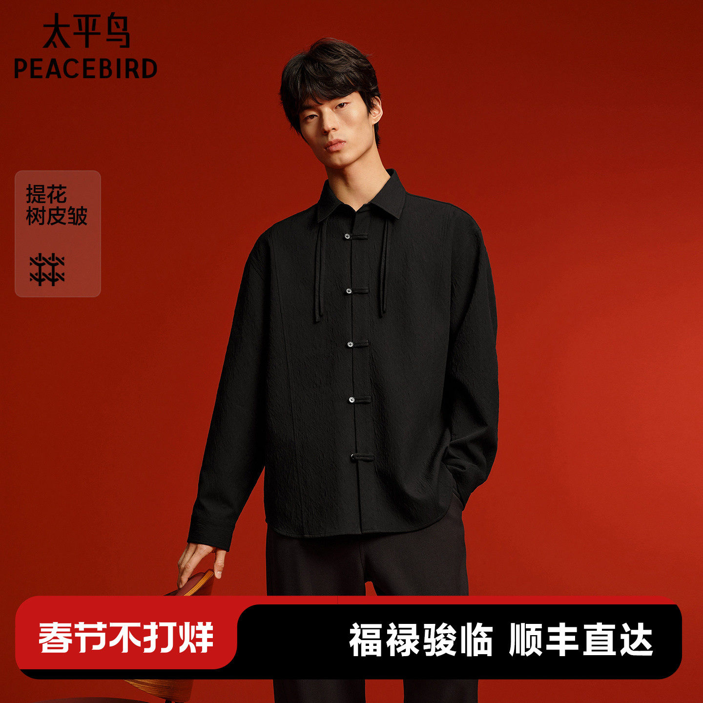 【新中式衬衫】太平鸟男装 休闲衬衫时尚新款国风盘扣提花衬衫男
