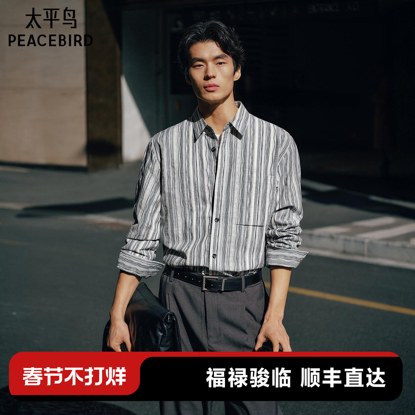 太平鸟男装 休闲衬衫2026春季新款肌理竖条时尚男士外穿式衬衫潮