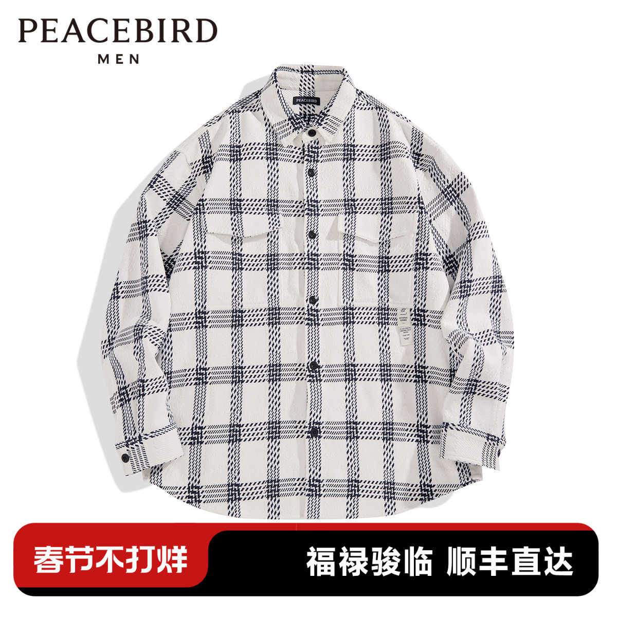 太平鸟男装 休闲衬衫时尚新款提花经典棋盘格衬衣宽松外穿式衬衫