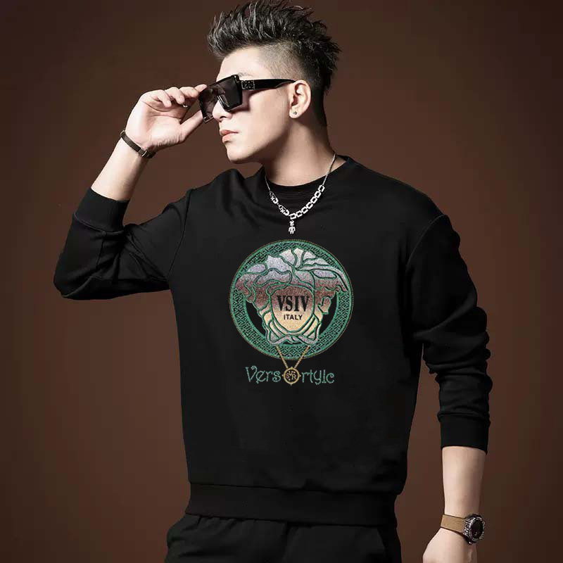 欧洲站春秋季新款男装卫衣字母烫钻内搭纯色打底衫套头圆领简约潮