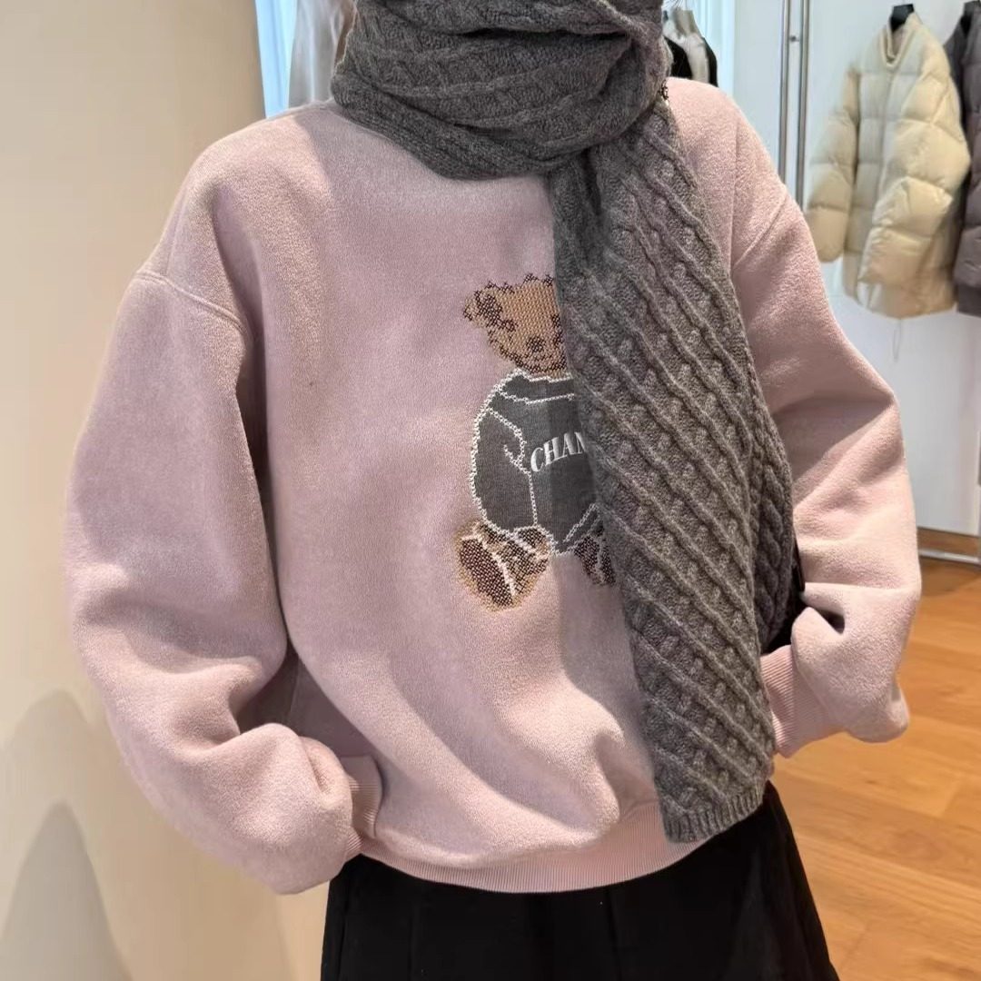欧洲站2025冬装新款欧货休闲宽松减龄小熊加绒卫衣女圆领套头上衣