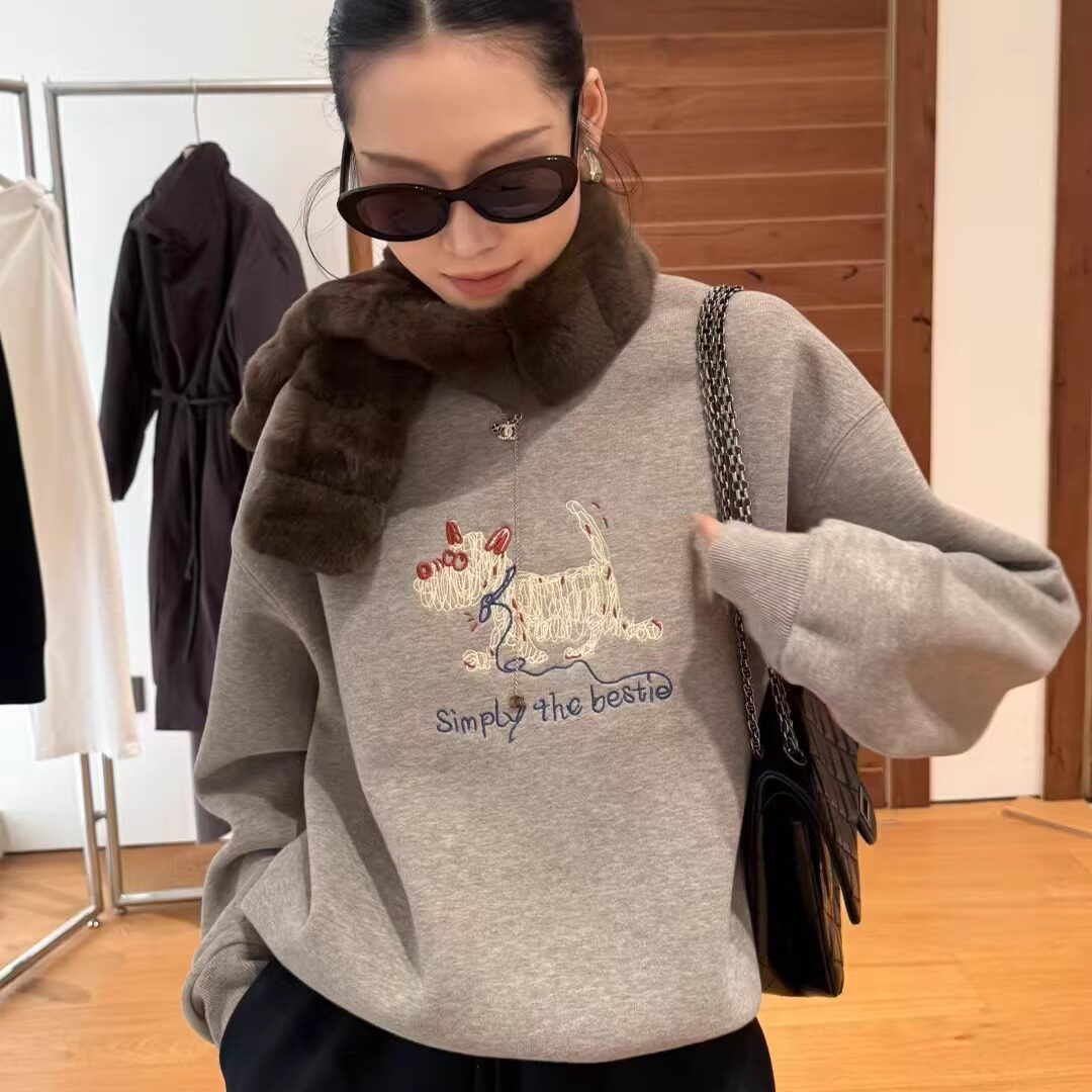 欧洲站2025冬装新款小狗刺绣圆领灰色加绒卫衣女休闲减龄套头上衣