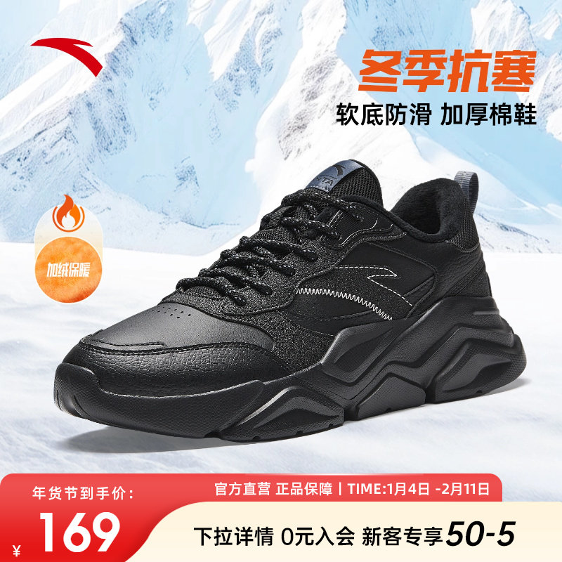 安踏运动鞋男鞋加绒保暖2025新款冬季皮面棉鞋男士加厚黑色休闲鞋