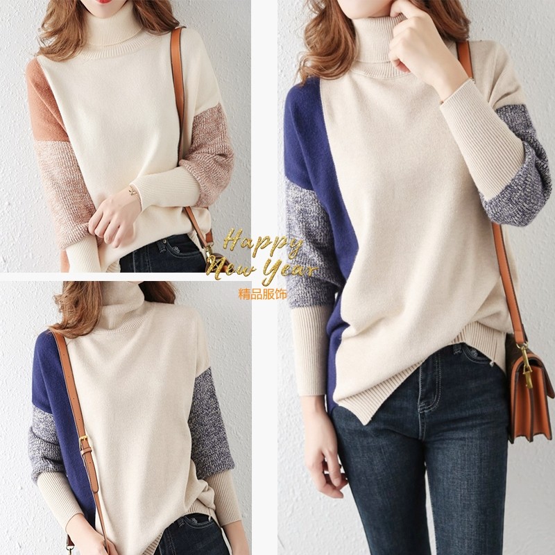 欧洲站秋冬款韩版高领拼色羊毛针织宽松女款毛衣套头长袖潮流百搭
