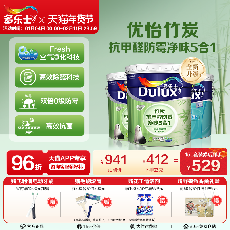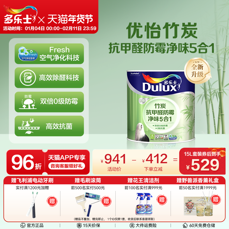多乐士乳胶漆优怡竹炭抗甲醛防霉净味5合1室内自刷墙面漆家用涂料