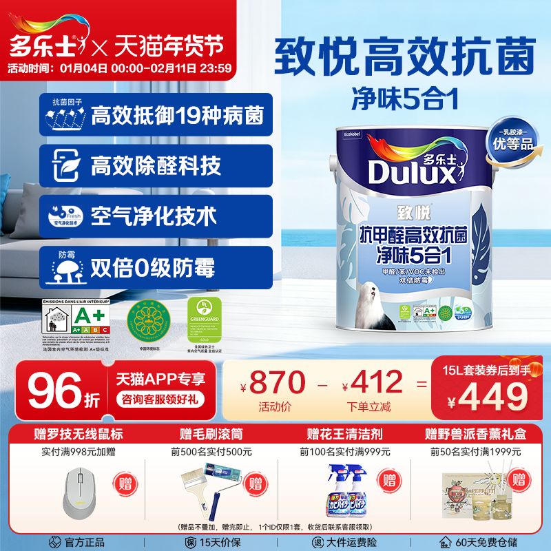多乐士致悦抗菌净味5合1乳胶漆双倍防霉家用室内墙涂料面漆耐擦洗