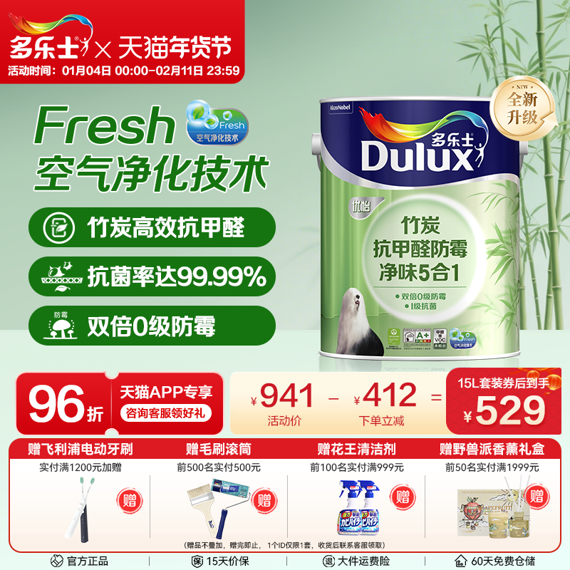 多乐士乳胶漆竹炭抗甲醛净味五合一室内家用油漆涂料环保墙漆面漆
