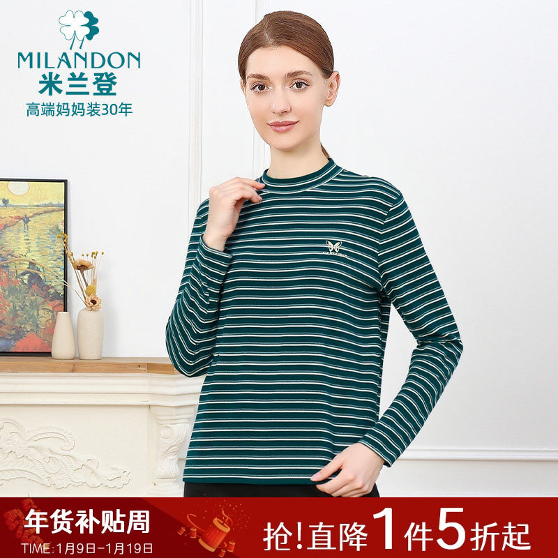 米兰登中老年妈妈装2025年秋冬季新款时尚条纹小衫女长袖T恤衫厚