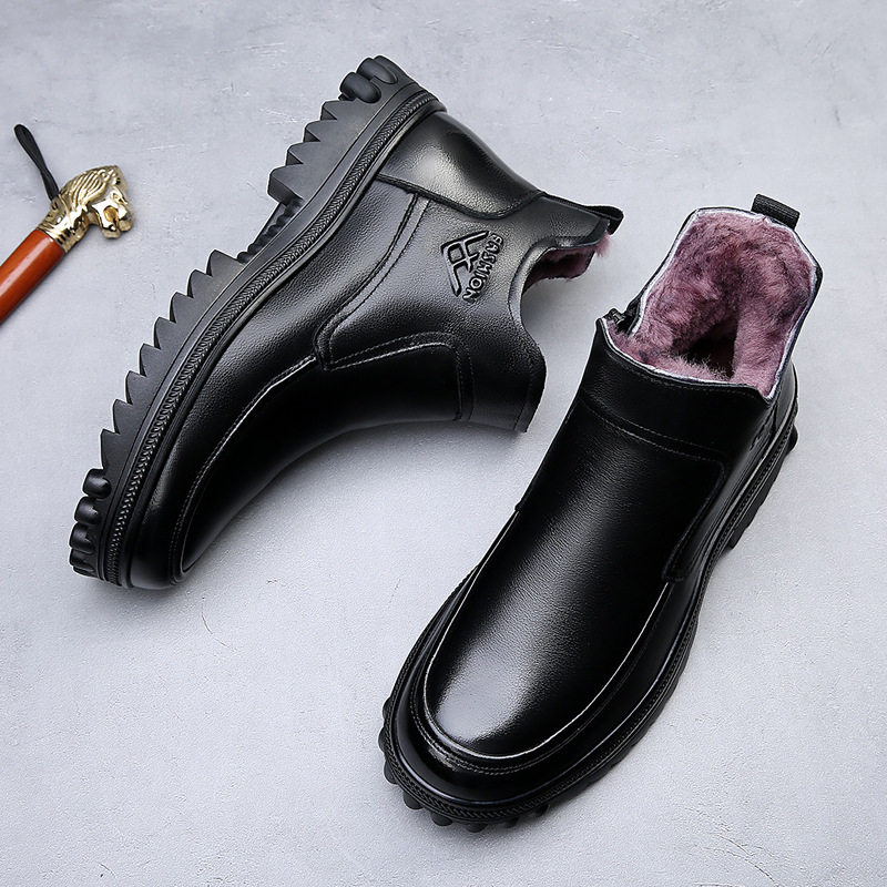 高端男式保暖中老年棉鞋帮2025冬季加绒加厚舒适真皮羊毛爸爸皮鞋