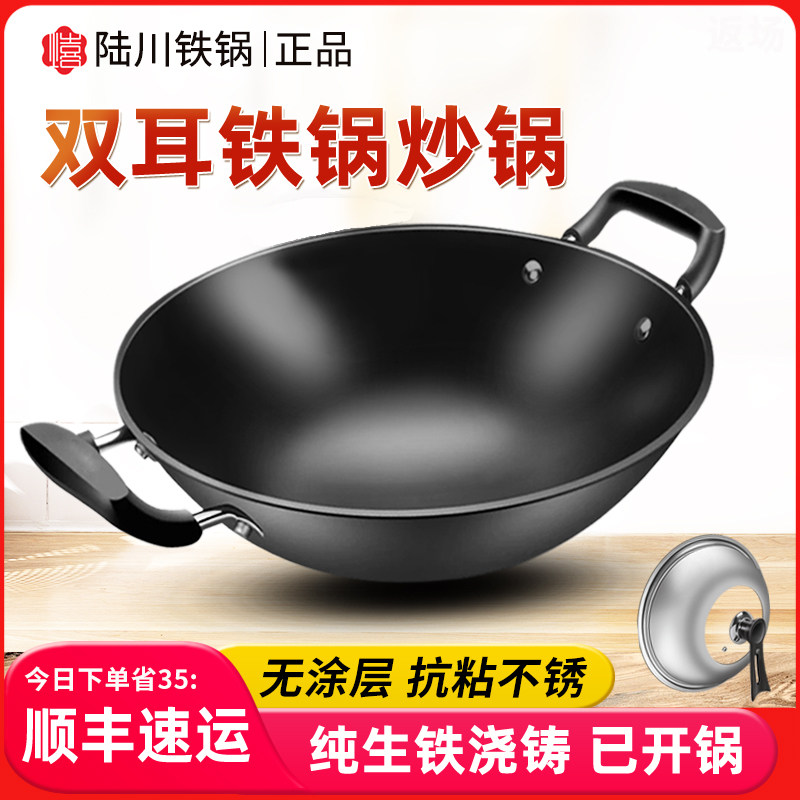 陆川生铁铸铁锅官方旗舰老式炒菜锅双耳圆底不粘无涂层燃气灶适用