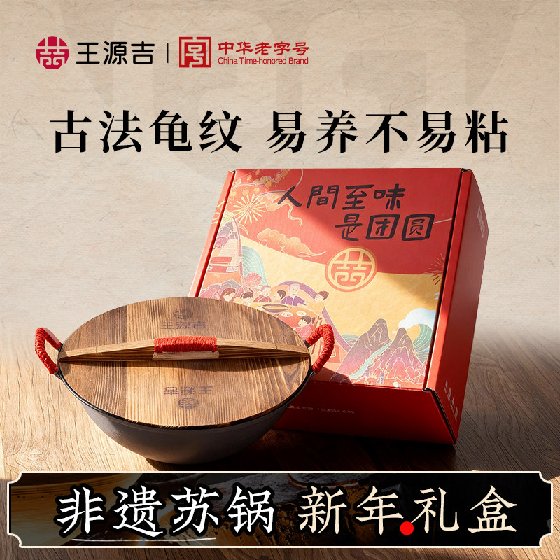 王源吉铸铁锅炒锅家用炒菜双耳广口苏锅无涂层老式铁锅家用生铁锅