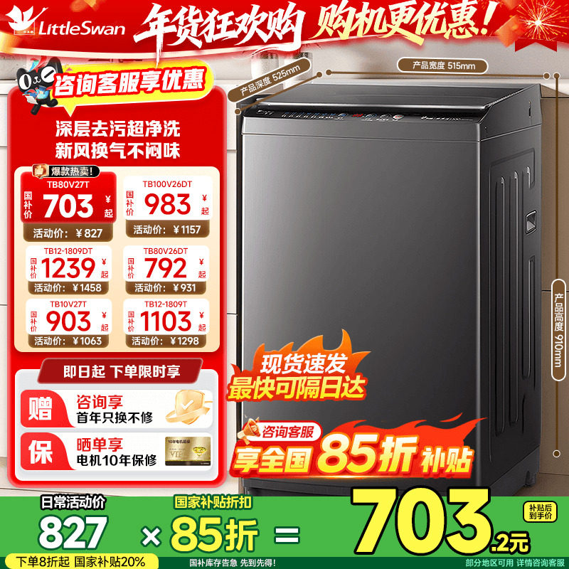 小天鹅12/10/8公斤一级变频全自动家用租房宿舍用波轮洗衣机26DT