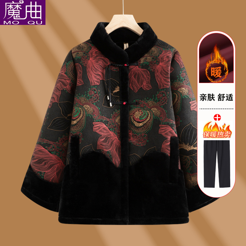 中老年人棉服女妈妈冬装加绒加厚皮毛一体外套国风仿皮草奶奶衣服