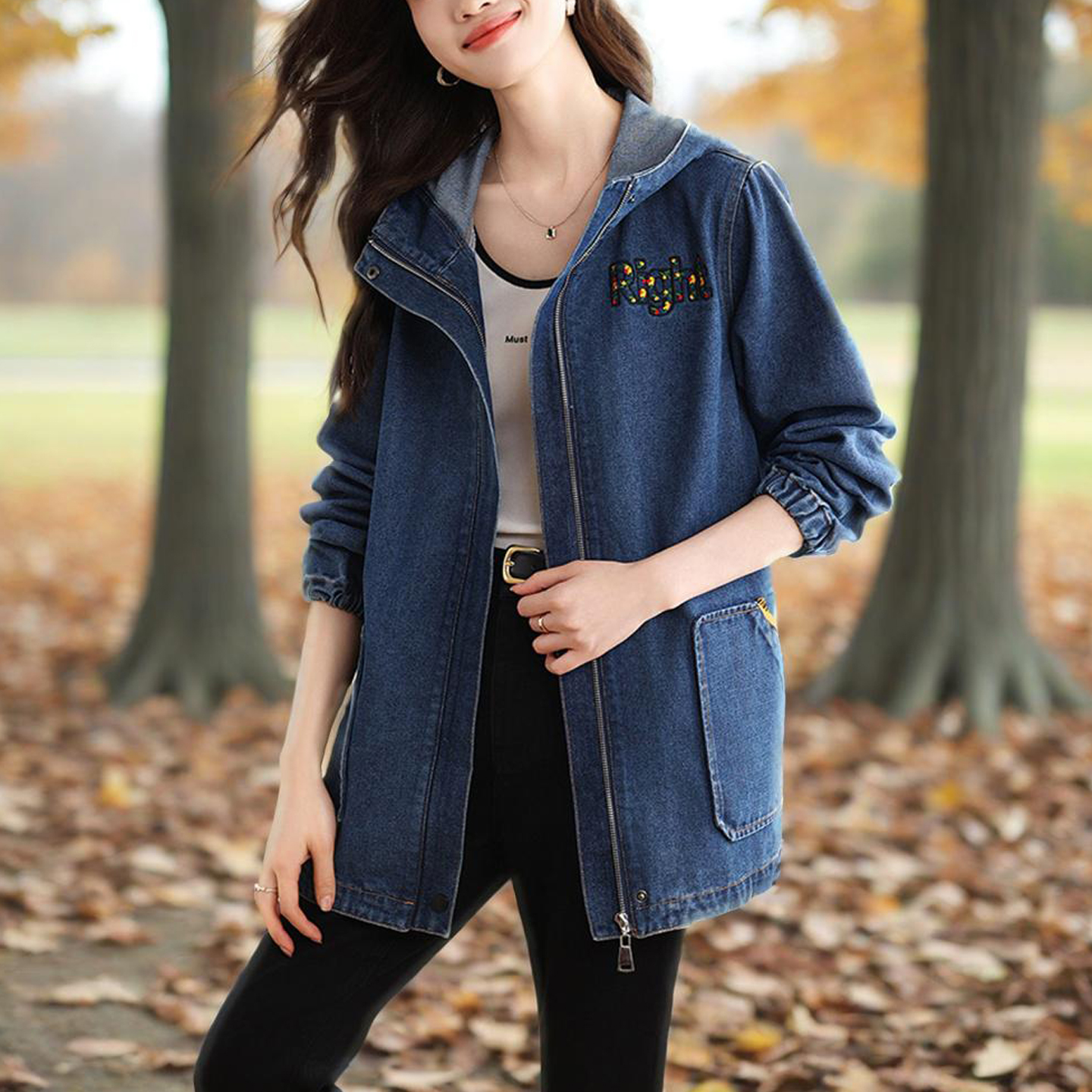 时尚牛仔外套女中长款2025春秋新款大码宽松休闲妈妈纯棉连帽风衣