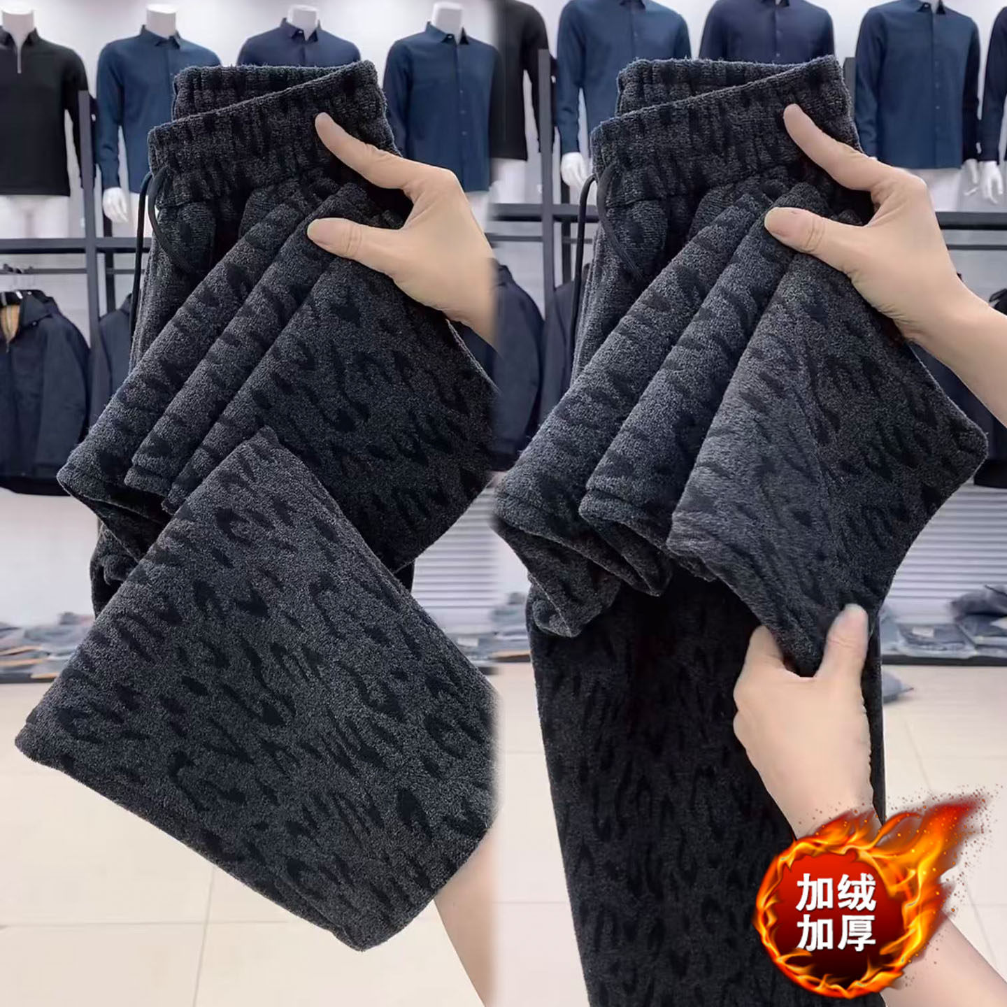 冬季新款灰色豹纹休闲裤女束脚高腰宽松九分裤加绒加厚直筒拖地裤