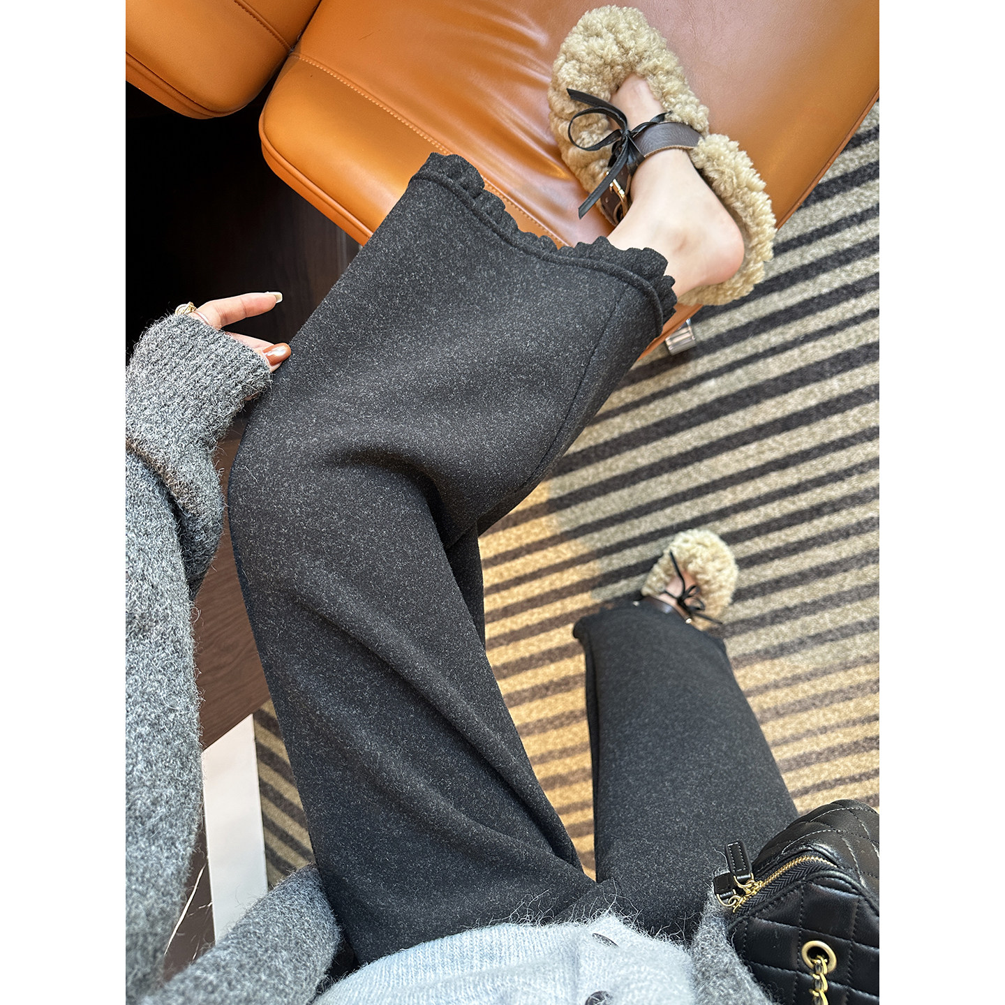 满分时髦!~灰色花边阔腿休闲裤女秋冬新款加厚宽松九分直筒裤子