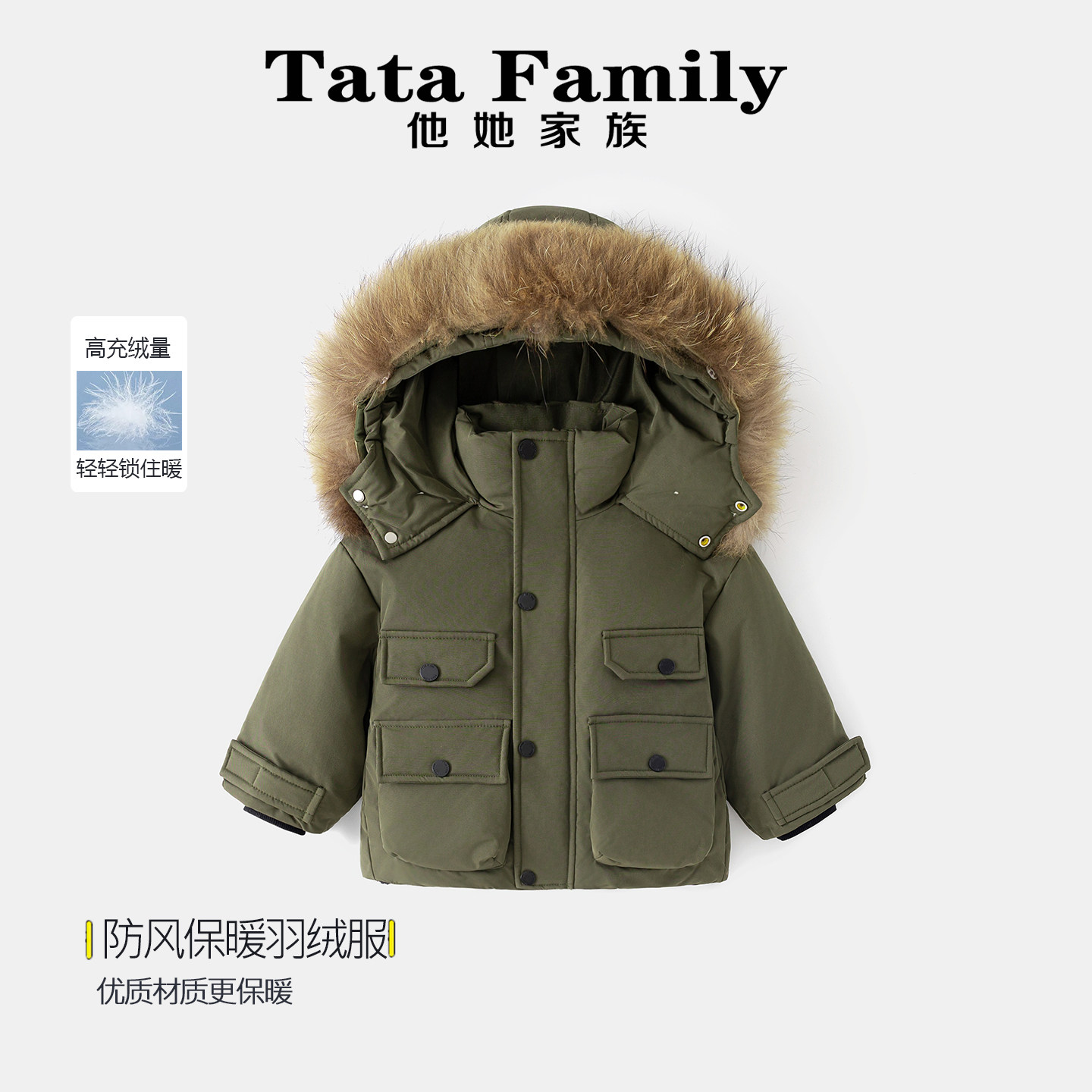 工装风连帽羽绒服男女童宝宝军绿色大毛领派克服保暖外套2025年新
