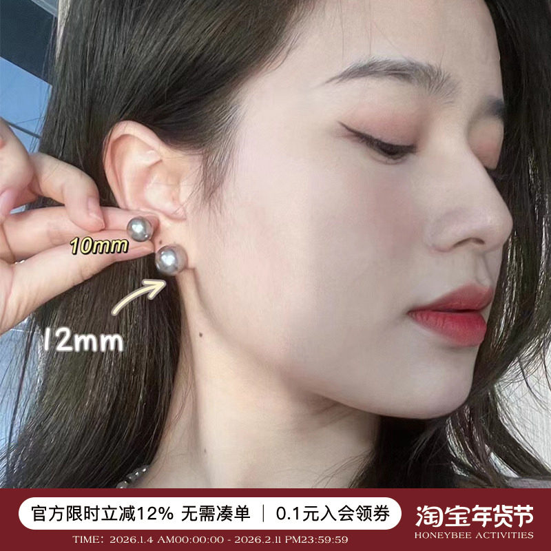简约时尚珍珠耳钉大溪地母贝黑珍珠耳环925银针防过敏耳饰送妈妈