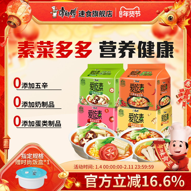 康师傅爱吃素方便面素食0添加川香麻辣烫桶装泡面袋装速食品夜宵