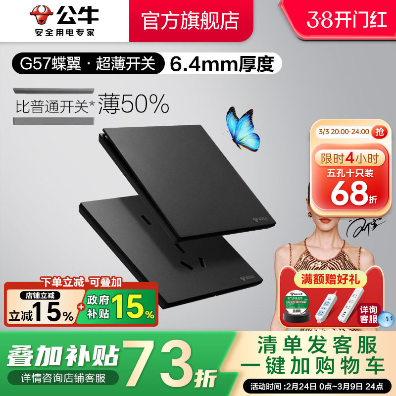 公牛蝶翼超薄G57开关五孔插座16a大师面板哑光奶油风墙壁暮雪白