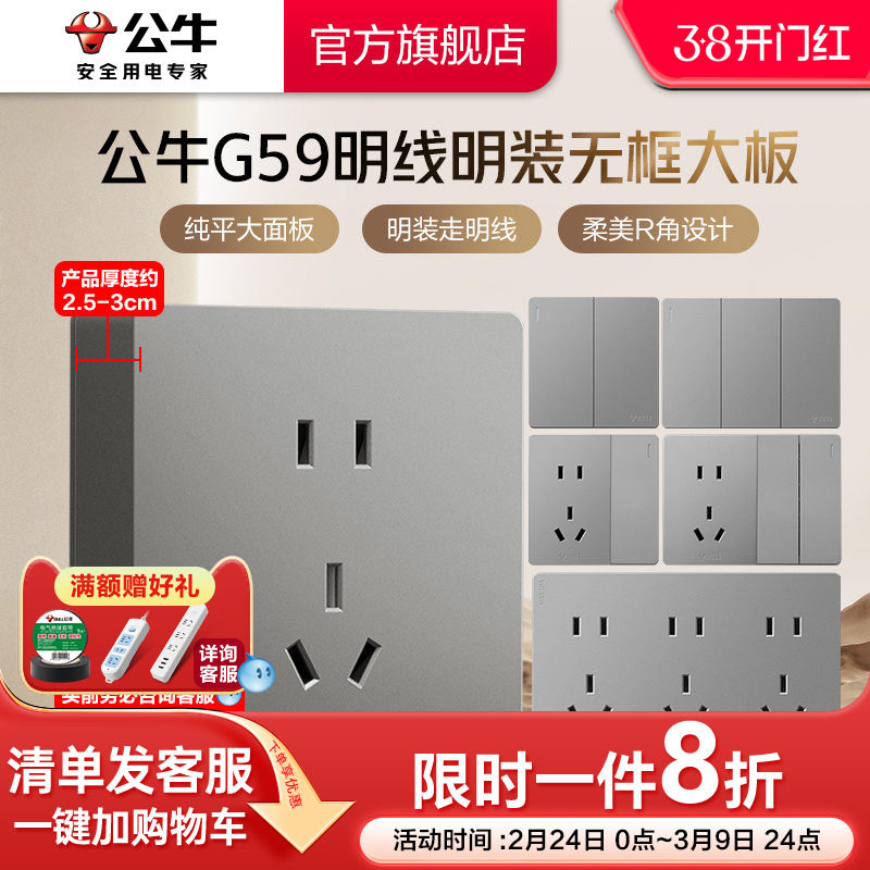 公牛旗舰明装插座开关空调16A插座五孔10A面板明装多孔插座G59灰