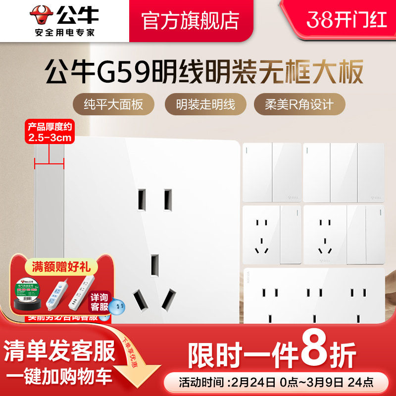 公牛旗舰明装插座开关空调16A插座五孔10A面板明装多孔插座G59白