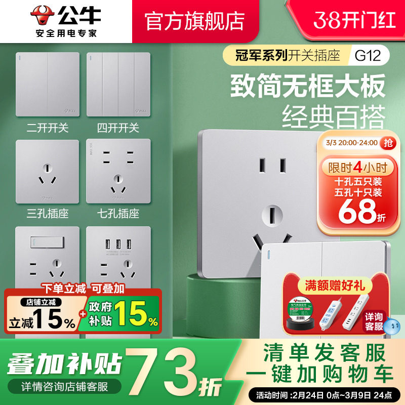 公牛插座旗舰店开关插座空调16A插座五孔10A面板暗装多孔G12银