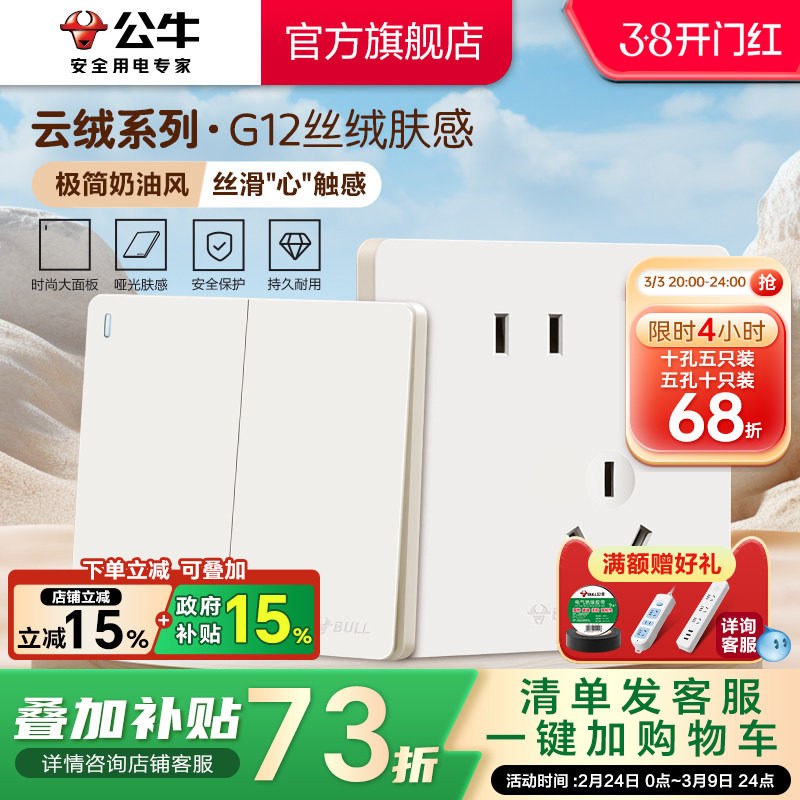 公牛官方旗舰店奶油风空调16A开关插座五孔面板肤感哑光g12米绒白