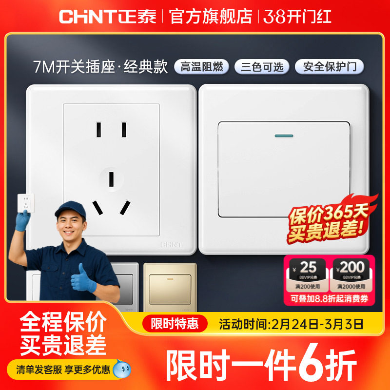 正泰旗舰店家用86型10a暗装墙壁空调16a一开五孔插座面板开关白7m