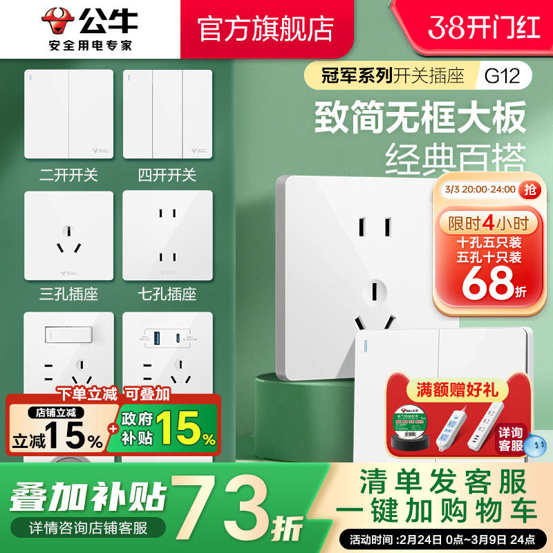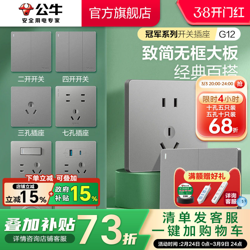 公牛官方旗舰店开关插座空调16A插座五孔10A面板暗装多孔G12白灰