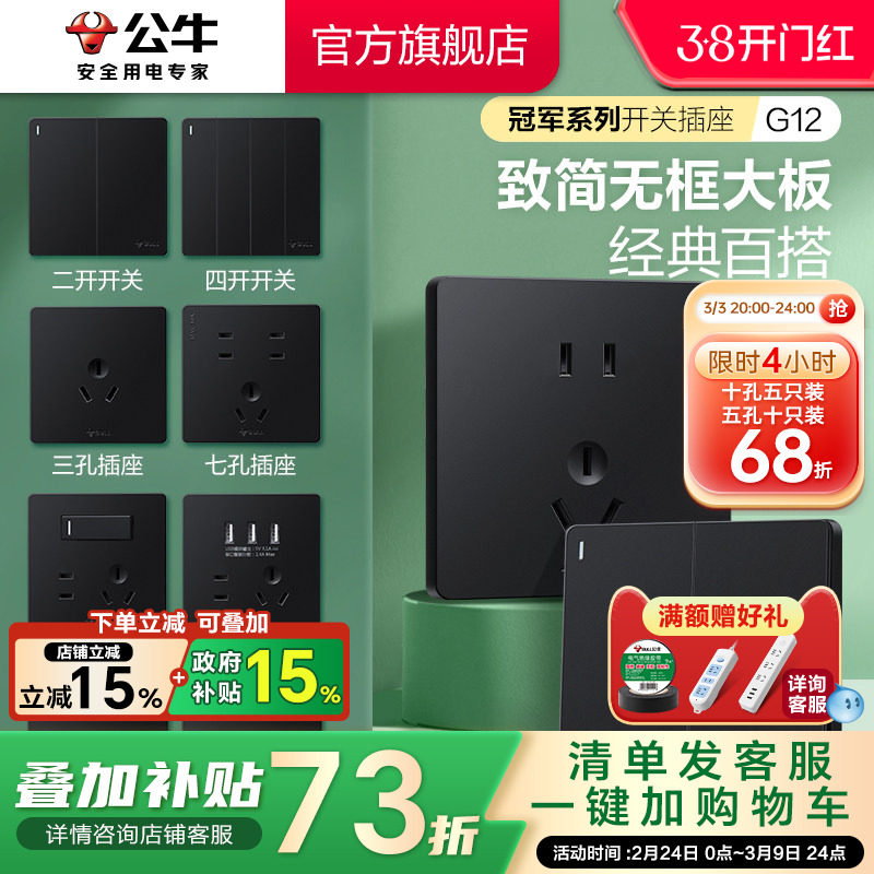 公牛插座旗舰店开关插座空调16A插座五孔插座10A面板暗装G12黑